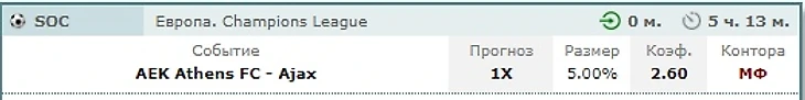 Аякс сильнее, чем АЕК — это понятно и без профессиональной экспертизы. Достаточно взглянуть на турнирную таблицу, в которой одни идут 2-ыми (8 очков в активе), другие — последними (1). Мотивация тоже на стороне голландцев, которые в шаге от плей-офф ЛЧ. К сожалению, линия в курсе этих нюансов, поэтому победа Аякса, не выигравшего ни одного из 4 последних выездов в ЛЧ, ценится слишком низко (1.74). Значит, надо ловить обратку. Первое, что надо понимать — стратегически Аяксу достаточно ничьей. Её не хватит лишь в том случае, если Бенфика сенсационно обыграет Баварию в Мюнхене, что маловероятно. Стало быть, гостям в Греции важнее удержать синицу в руке (ничью), чем рисковать ради журавля в небе (победы). Ничья с 99%-ой вероятностью выведет Аякс в плей-офф ЛЧ. Побеждать необязательно. Побеждать крупно — тем более. Похожая ситуация была в августе, в квалификации ЛЧ. Тогда после домашней победы над Динамо (3:1) голландцы довольствовались ничьей в Киеве (0:0), хотя по классу и игровым характеристикам существенно превосходили соперника и могли снова побеждать. Второе — технически АЕК сохраняет шансы пробиться в еврокубковую весну. Нужно не проиграть здесь, а в последнем туре обыграть Бенфику. Причем грекам неважно, вничью они сыграют с Аяксом, или обыграют его. Главное — не проиграть. Впрочем, это не единственный резон сражаться. Стыдно завершать групповой этап ЛЧ без очков, проиграв 6 матчей из 6. Последний домашний матч — не единственная, но самая реальная возможность добиться положительного результата. Неизвестно, когда АЕК снова попадет в ЛЧ. Если в футболистах есть хоть капля самолюбия, они постараются громко хлопнуть дверью. В предыдущем розыгрыше ЛЧ, например, лишь 1 из 32 команд проиграла все матчи группового этапа. Остальные набирали как минимум 1 очко. Третье — кадровые новости. У гостей они плохие — травмирован Зиеш, безоговорочный лидер команды (7 голов, 5 ассистов, 6 раз был игроком матча). У хозяев, наоборот, возвращаются после дисквалификации Лопеш и Ливая, после травмы — Кошич и Клонаридис. Значительное усиление состава повышает шансы хозяев на успех. Четвертое и последнее — пресловутый фактор своего поля, который в еврокубках даже весомее, чем во внутренних чемпионатах. Вон, даже скромная Црвена Звезда, безнадежно слившая все выезды, дома не проиграла ни Ливерпулю (2:0), ни Наполи (0:0). Сам АЕК целый час держал 0:0 с Баварией, а Бенфике уступил минимально, пропустив в концовке (2:3). В свою очередь, Аякс выиграл лишь 1 из 7 последних выездов в ЛЧ, хотя 5 из них были в рамках квалификации, где соперники попроще. Длинную дистанцию? Пожалуйста — 2 победы Аякса в 19 последних выездных матчах ЛЧ, причем обе в квалификации (1:2 Ростов, 1:3 Штурм. Хозяев явно недооценивают, попытаюсь этим воспользоваться.