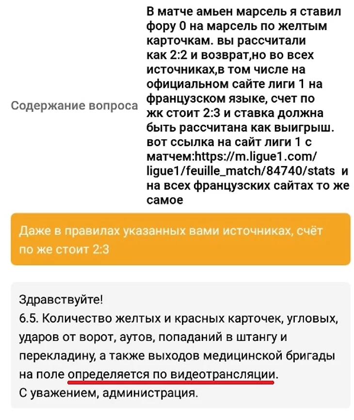 Ситуация развивалась следующим образом. Матч закончился в час ночи, на Myscore отображалось 2:2 в графе жёлтых (у Амьена ЖК на 49 и 83 минутах, у Марселя - 14 и 72). По такому исходу должен быть возврат ставки, что и произошло.