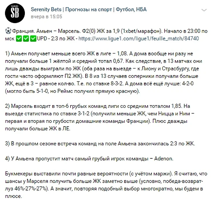 В паблике Serenity Bets на этих выходных дал прогноз на Ф2(0) ЖК в матче французской лиги Амьен - Марсель за 1,9 по линии марафона/1xbet. Эта ставка также была у ряда других букмекеров - париматч, бетсити, лига ставок, зените, олимпе, фонбете и т.д.
