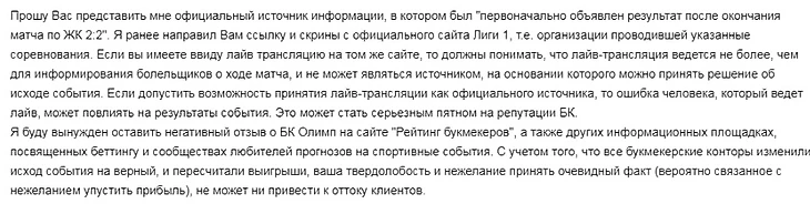 3) Следующий шаг - настойчиво продолжать им писать, чтобы они предоставили источники информации, конкретный пункт их правил и т.д. Можно подключить Рейтинг Букмекеров, написав им жалобу.