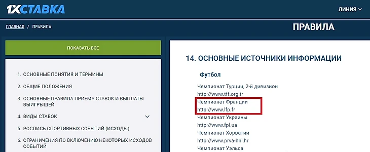 1) Заходите на сайт букмекерской конторы, ищите там правила. В правилах указаны источники, откуда они берут информацию для расчёта ставок. В частности, у 1xcтавки для Франции это официальный сайт Лиги 1: