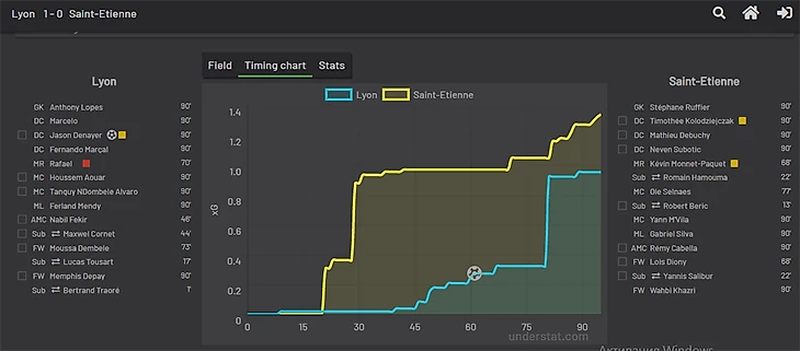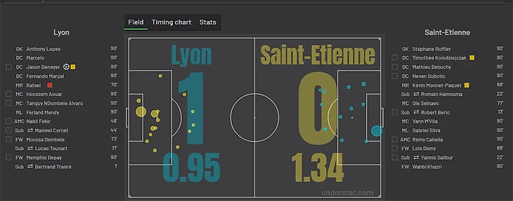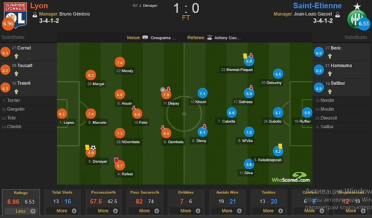 Вот такое дерби. «Лион» забивает с одного удара в створ. Всего 15-20 минут игры показали «ткачи» в этом матче. Лучший игрок по моему мнению - Ндомбеле, как по мне очень толковый разносторонний опорник, там «Барса» уже 80 лимонов дает за него. А так посмотрите даже лучшие игроки у «Лиона» вратарь и все защитники. Хотя Денайеру, как по мне, за гол такую оценку дали завышенную, терял он позицию частенько, особенно в первом тайме. Хваленый Ауар слабенько, но во втором тайме наладил с точностью передач, хотя он должен показывать себя именно в таких матчах, горловых. У «СЭ», ну там понятно, Хазри и Кабелла.. В Англии им делать, конечно, нечего, они там и провалились по большому счету, а вот в «СЭ» самое оно для них. Вообще вся игра лиона не понравилась. Разрозненно как-то, больше полагаясь на индивидуальное мастерство Мемфиса, Фекира и иже с ними. XG посмотрим, у «зеленых» 1,34 а у «ткачей» 0,95, и то он начал расти не до гола, что странно, а уже в меньшинстве когда играли, когда «СЭ» открылся и побежал вперед без оглядки.. там и полумоменты у «Лиона» начали появляться..