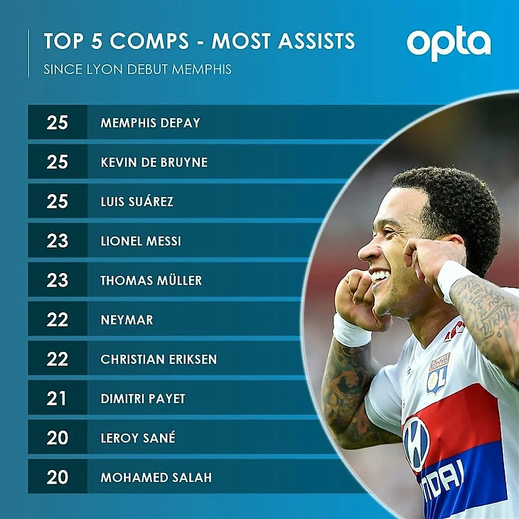 Но великие великими, а у нас свои герои. Мемфис Депай. 7 голов и 4 ассиста в последних 9 матчах. В огне просто. Кстати любопытная статистика.. никто не отдал больше голевых чем Депай с момента дебюта его в Лиги 1 в 2017 году. Де Брюйне и Суарес отдали также по 25 ассистов. Хотя я бы не сказал, что Депая снова нужно забирать в топ клуб, в «Лионе» он, как по мне, как раз на своем месте.