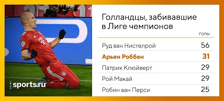 • Роббен – второй голландский бомбардир в истории ЛЧ. Ему 34, шансы достать Руда ван Нистелроя ничтожны. Но и самому Арьену пока никто не угрожает.