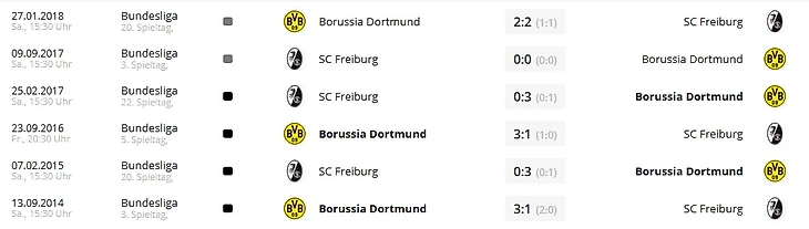 В сентябре прошлого года "Фрайбургу" удалось сыграть с "Боруссией" вничью, тем самым была прервана 12-матчевая серия поражения в играх с дортмундским клубом