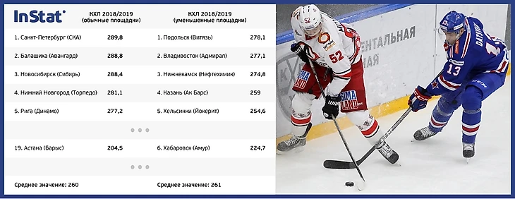 Колонка «единоборства» должна была быть флагманской для уменьшенных площадок, но на деле всего «+1» – 261 на 260 в среднем за матч. И тут российский формат льда не отстает. Показательно и удивительно, что в КХЛ чаще всего в единоборства вступает техничный СКА. Незначительно отстают сибирские клубы – «Авангард» и «Сибирь». Совсем не любит контакта «Барыс».