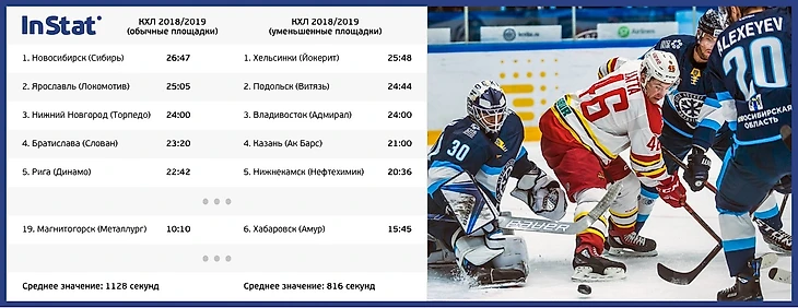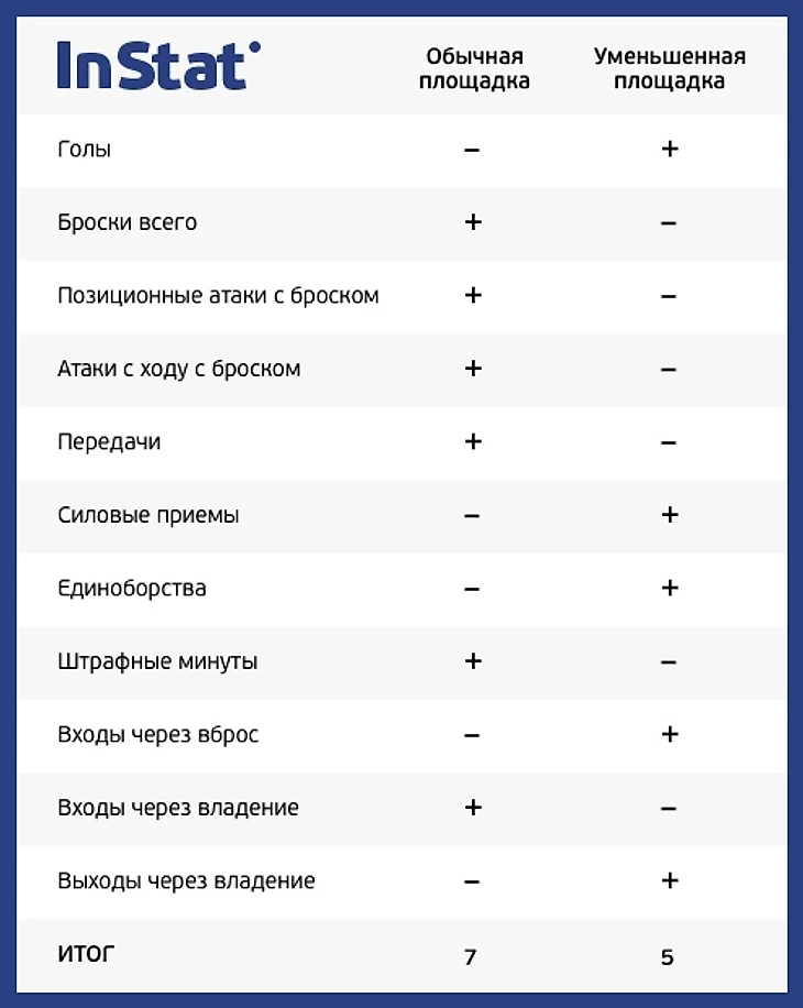 Штрафные минуты, в свою очередь, превалируют не там, где больше контактной борьбы, то есть на «финских» или «канадских» площадках, а как раз наоборот. 1129 секунд на 816 в среднем за матч. Тут есть одно «но» – реализация большинства останавливает счетчик, что может говорить о плюсах уменьшенной площадки для спецбригад большинства. НХЛ этот тезис подтверждает – 899 секунд.