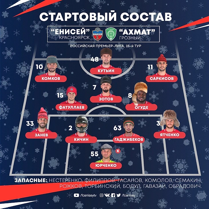 «Енисей» – самый бодрый футбольный клуб России, который умеет и может в SMM и иронию. Перед матчем с «Ахматом» они выставили утепленный состав, добавив игрокам разные головные уборы: от традиционных ушанок до кепок-«беляшей» и паленых «Gucci».