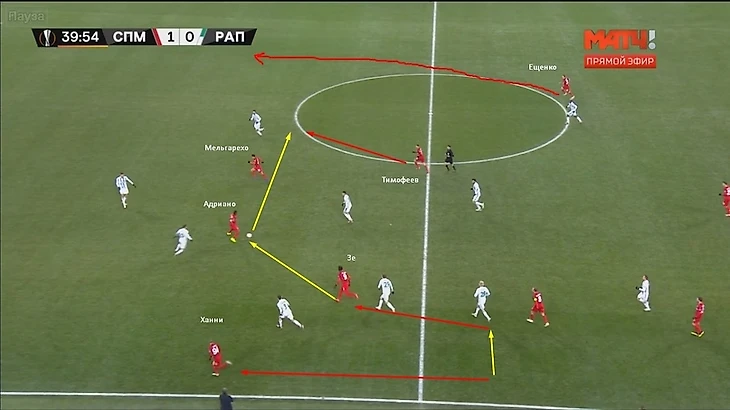 Но несмотря на это ставка на быструю доставку мяча вперёд после отбора всё-таки сработала на 20й минуте. Рапид забрасывал в линию атаки и его прервал Глушаков. мяч подобрал Кутепов, который сделал передачу на сместившегося в центр Ханни. Тот отдаёт на Мельгу, а индеец в касание на Зе Луиша, который вновь использует пространство между Хофманом и Мулдуром. Дальше выход 1 на 1 и гол: