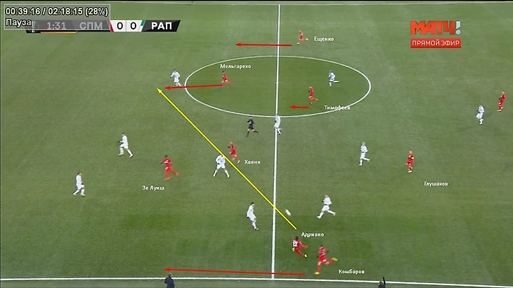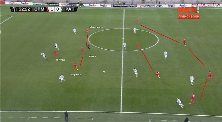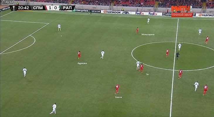 Ситуация после перехвата мяча Зе Луишем. Тимофеев получает пас и отдаёт сразу на нового плеймекера Спартака - Ханни. Зе Бежит вперёд, а Адриано освобождает фланг смещением в центр: