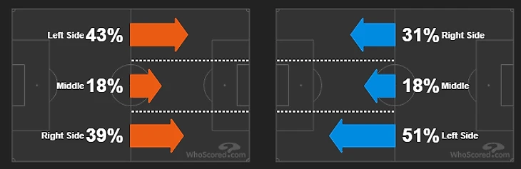 Направления атак «Арсенала» (слева) и «Тоттенхэма» (справа).