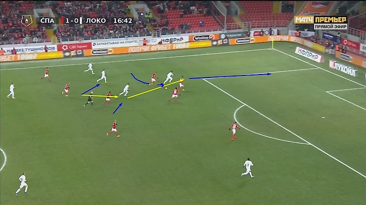 Если говорить о комбинациях, которые начинали на одном фланге, а затем переводили на другой, то их практически не было, потому что Локомотив всячески пытался предотвратить такое развитие событий прессингом флангов на чужой половине поля (чуть позже о них). Да они как элемент игры возникали при других эпизодах, но так, чтобы вся атака прошла от ворот и до ворот соперника - практически не было.