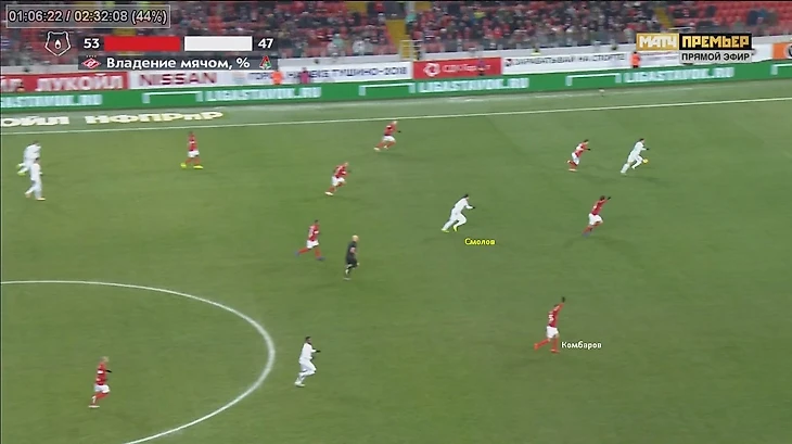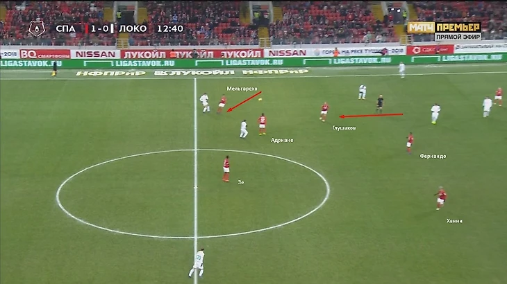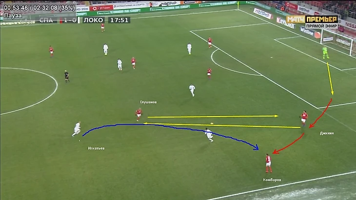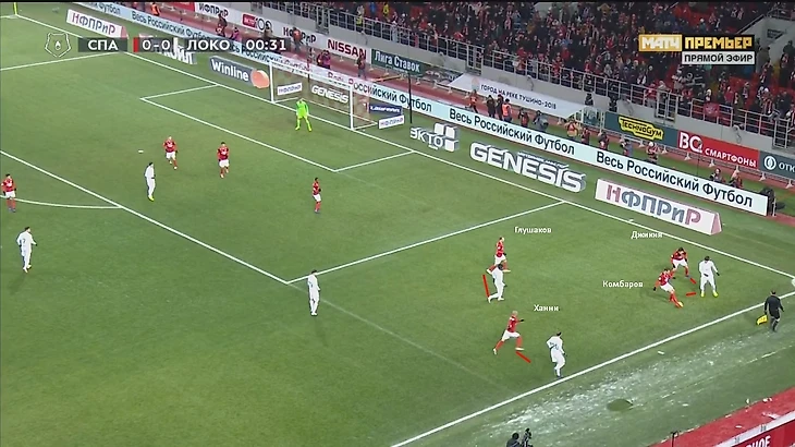 Однако порой включение в прессинг крайних защитников вызывало очень большие проблемы. Игнатьев помешает Глушакову развить атаку, но в результате оставит свободную зону за спиной, куда пойдёт быстрая атака Спартака: