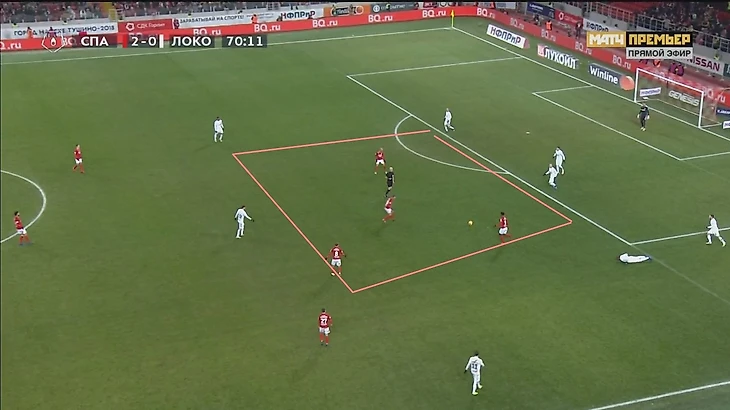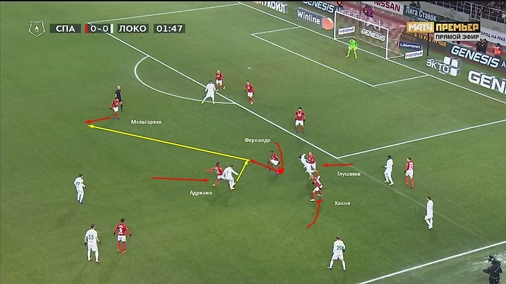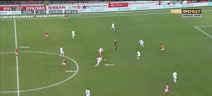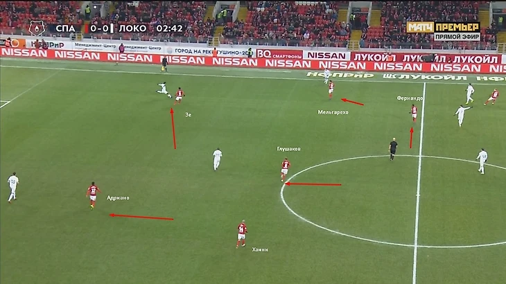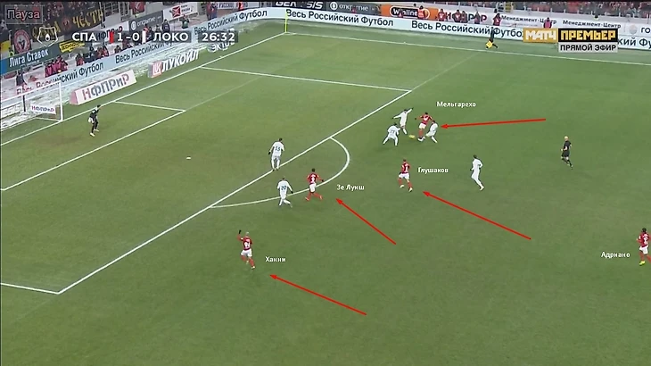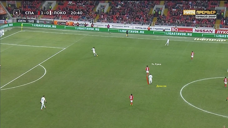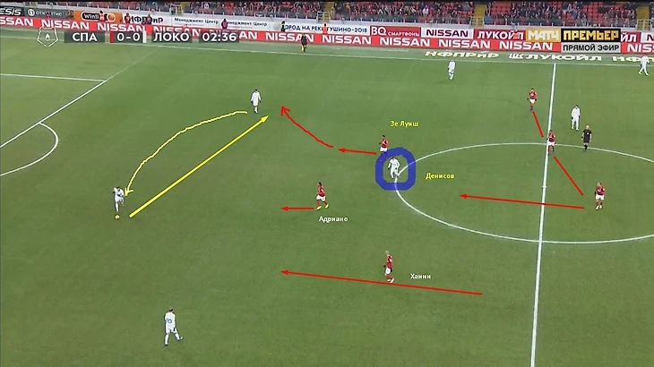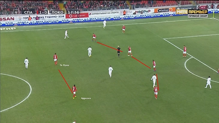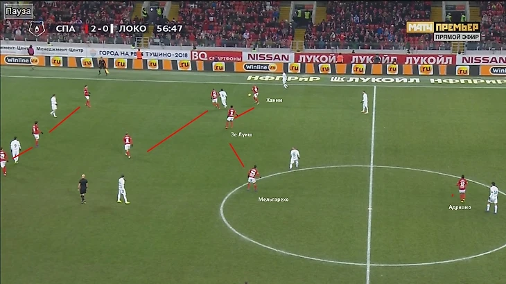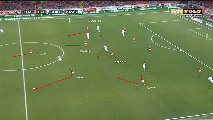 Что касается прессинга, то тут Спартак вновь не использовал высокое давление. Когда защитники Локо начинали разыгрывать мяч главной задачей первой линии обороны (из Адриано, Зе Луиша и одного из фланговых игроков) было перекрыть пас на Игоря Денисова и заставить отправить мяч либо длинно, либо передать на фланг, где его проще отобрать: