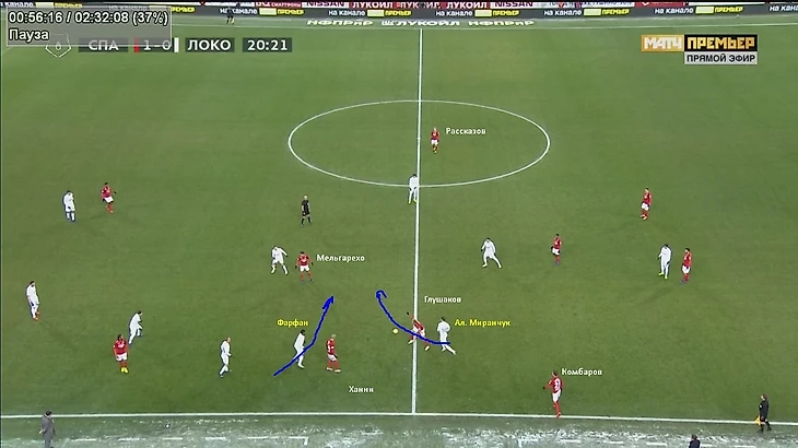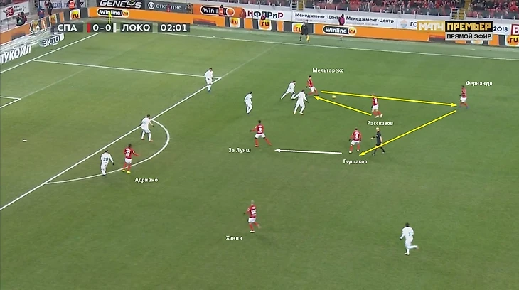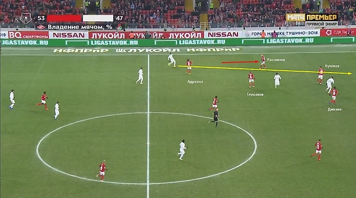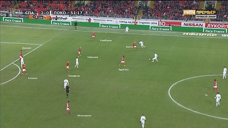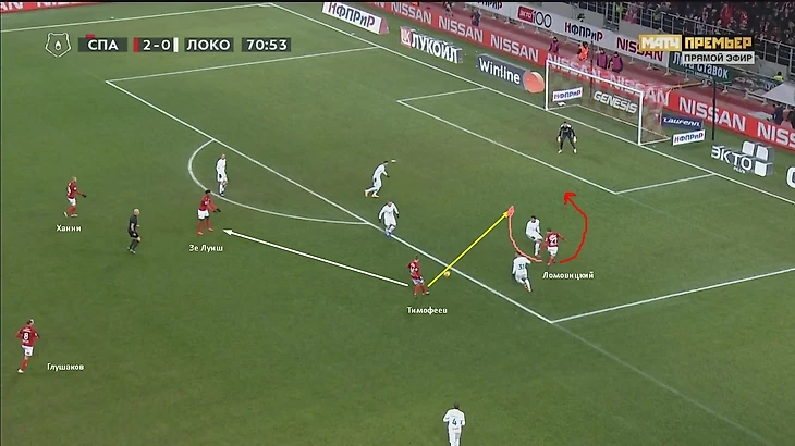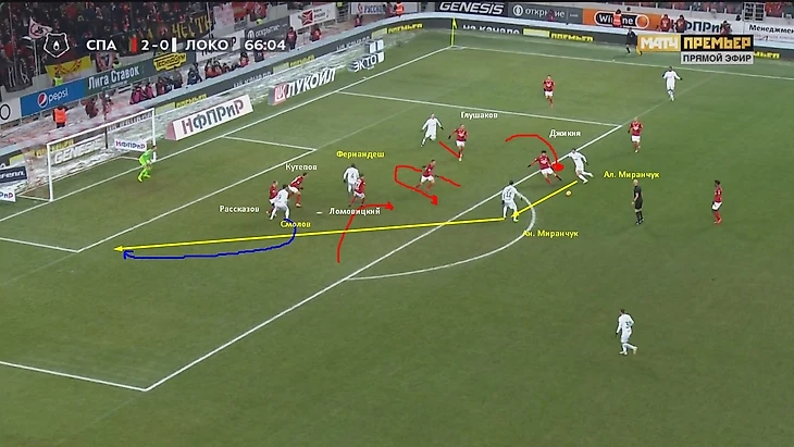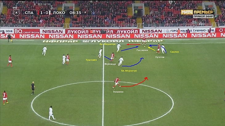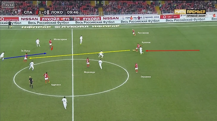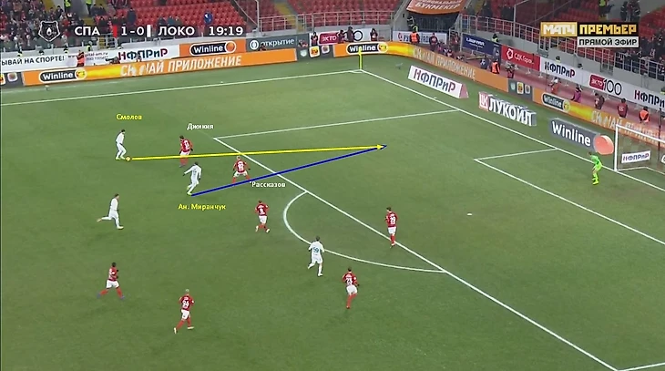 Эту брешь в обороне Спартака Локо использовал много раз. Вот Рассказов пятится назад и оказывается полупозиции. Идёт передача между Николаем и Кутеповым на Миранчука: