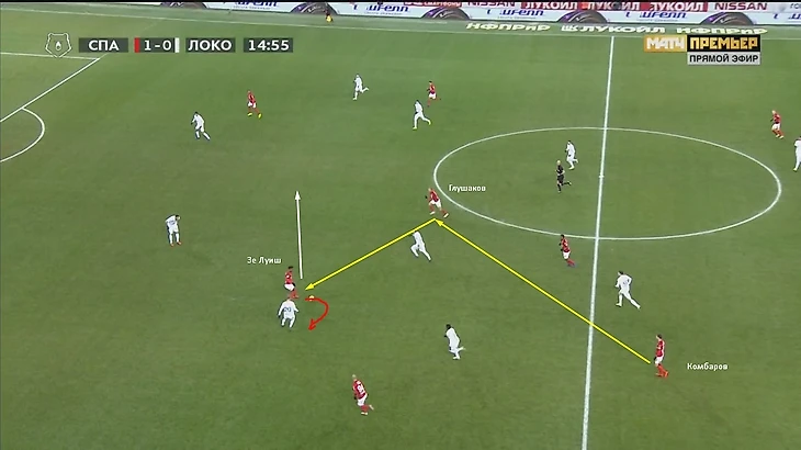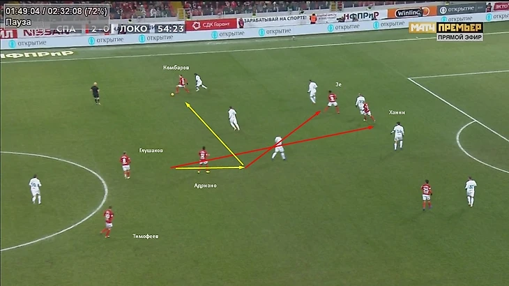 Вот здесь видно ту самую дыру, которую оставлял Локо в центре. Комбаров пасует на Глушакова, тот на Зе Луиша, который мог бы вернуть Денису обратно, но Зе плохо обработал и Денисов скорее всего уже прервал бы передачу:
