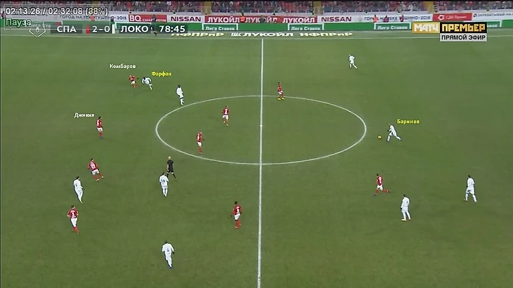 А Локо продолжит оставлять полузащиту Спартака без особого внимания вплоть до конца матча. Это стандарт (аут), так что можно было бы и закрыть Тимофеева, который выиграет очередной подбор:
