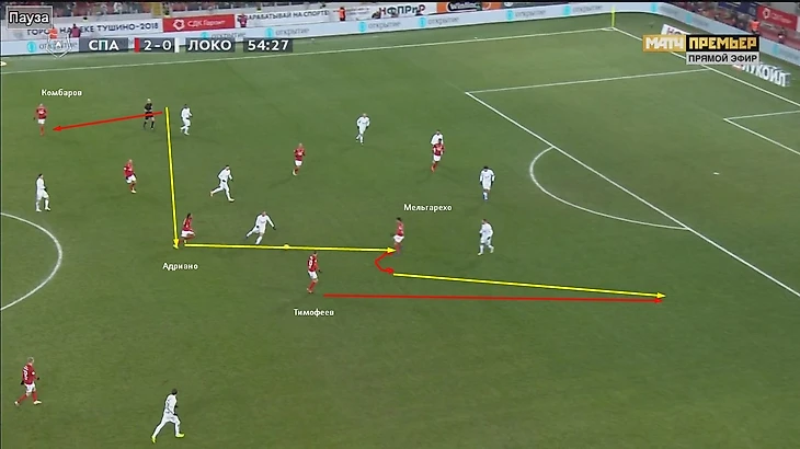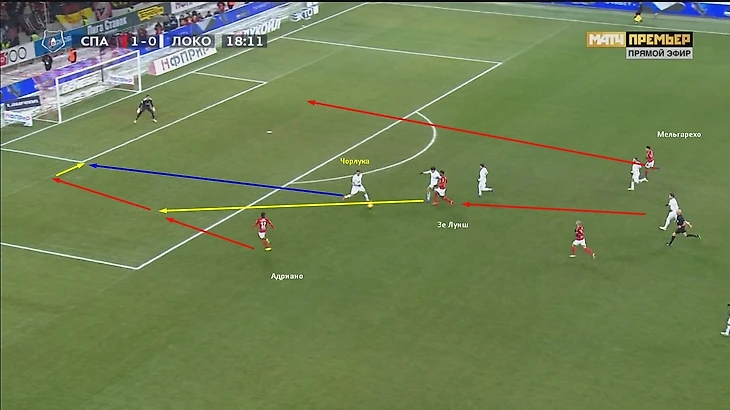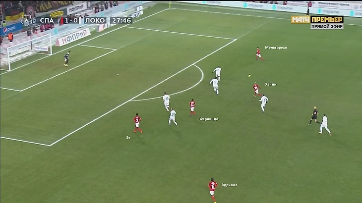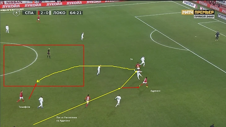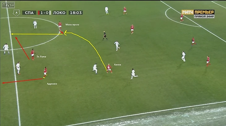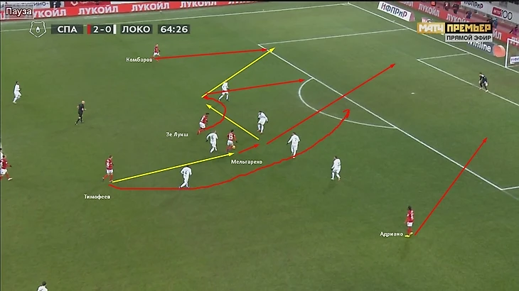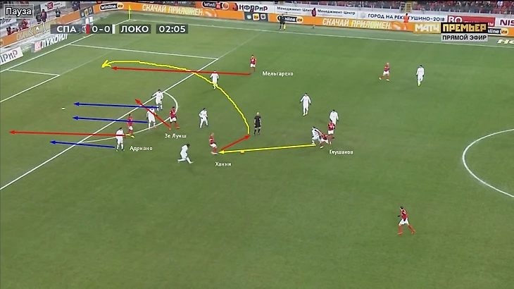 Ещё одна контратака Спартака и свободная зона в центре, которой воспользуется Мельгарехо и отдаст в развитие атаки на Зе Луиша. Адриано начнёт забег по флангу: