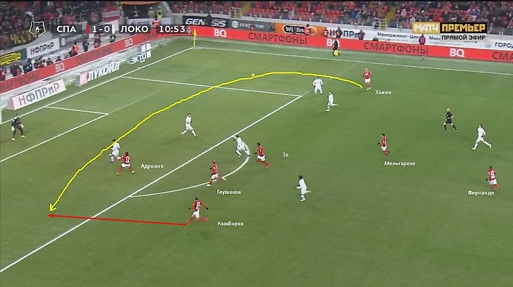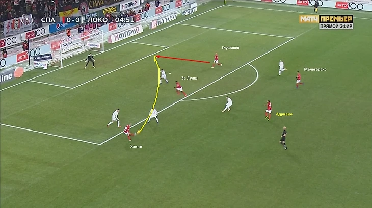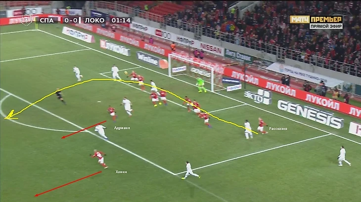 Это приводит к угловому, причём команда явно успела поработать не только над обороной при стандартах, но и при расположении игроков при выходе в атаку. Напомню, что "Спартак" предпочитает использовать минимум передач и как можно скорее отправлять мяч на свободное пространство. Как правило, первым адресом при быстром выходе в атаку был, как и в предыдущих двух матчах, Ханни. Рассказов отправляет мяч вперёд, а Адриано начинает забег: