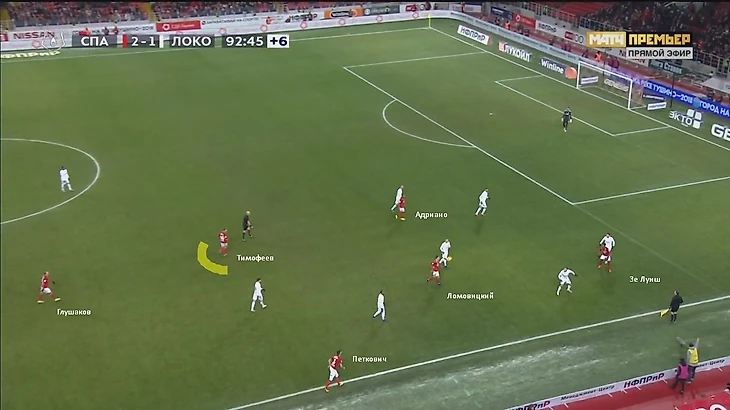 Во втором тайме Спартак стремился забить третий мяч и предпосылки к этому все были, ведь Локо продолжал оставлять кучу пространства в центре. Вот тут без всякого сопротивления подбор остаётся за Тимофеевым: