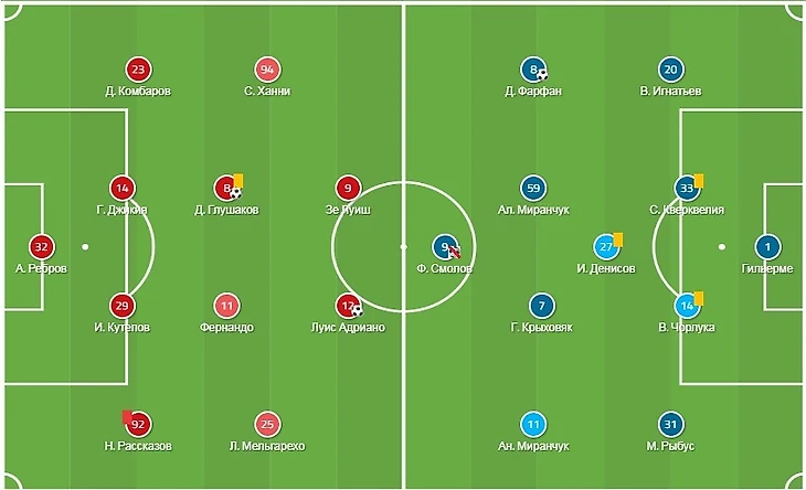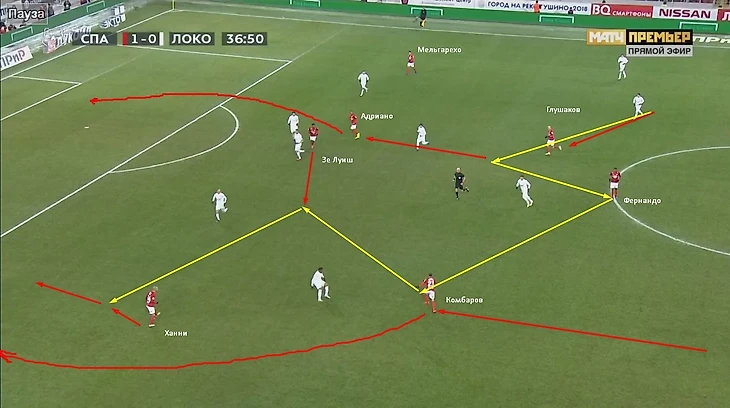Впрочем, один раз это получилось и наконец то, что было видно в предыдущих матчах завершилось голом. Глушаков с фланга пасует на Адриано, который отдаёт назад на Фернандо. Тот на фланг на вбегающего на свободное пространство Комбарова. Дальше идёт передача на Зе, которой отправляет мяч к Ханни. Комбаров в это время делает забег через полуфланг, а Адриано идёт в штрафную. Ханни подаст и гол: