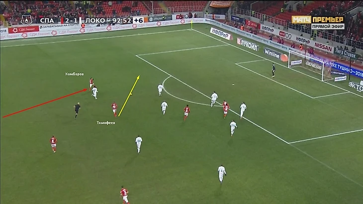 Пропущенный мяч - результат проигранного забега Комбарова и Джикии Фарфану. Вот начальные стартовые позиции перед длинной передачей Баринова, но на мяче первым будет нападающий Локо, который буквально на четверть секунды раньше начнёт свой разбег:
