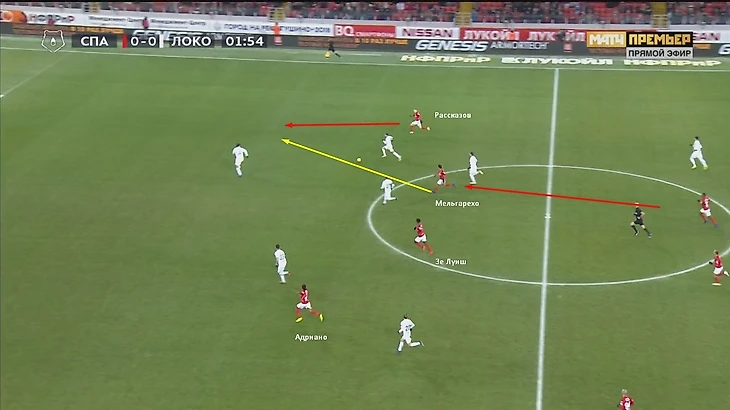 Мельгарехо бежит вперёд и пасует на Рассказова. Отмечу, что практически во всех контратаках, которые организовывал "Спартак" участвовало минимум 4 игрока: