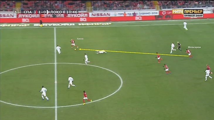 После нескольких подготовительных передач Ханни смещается в центр, получает мяч от Глушака и делает заброс в сторону Мельгарехо: