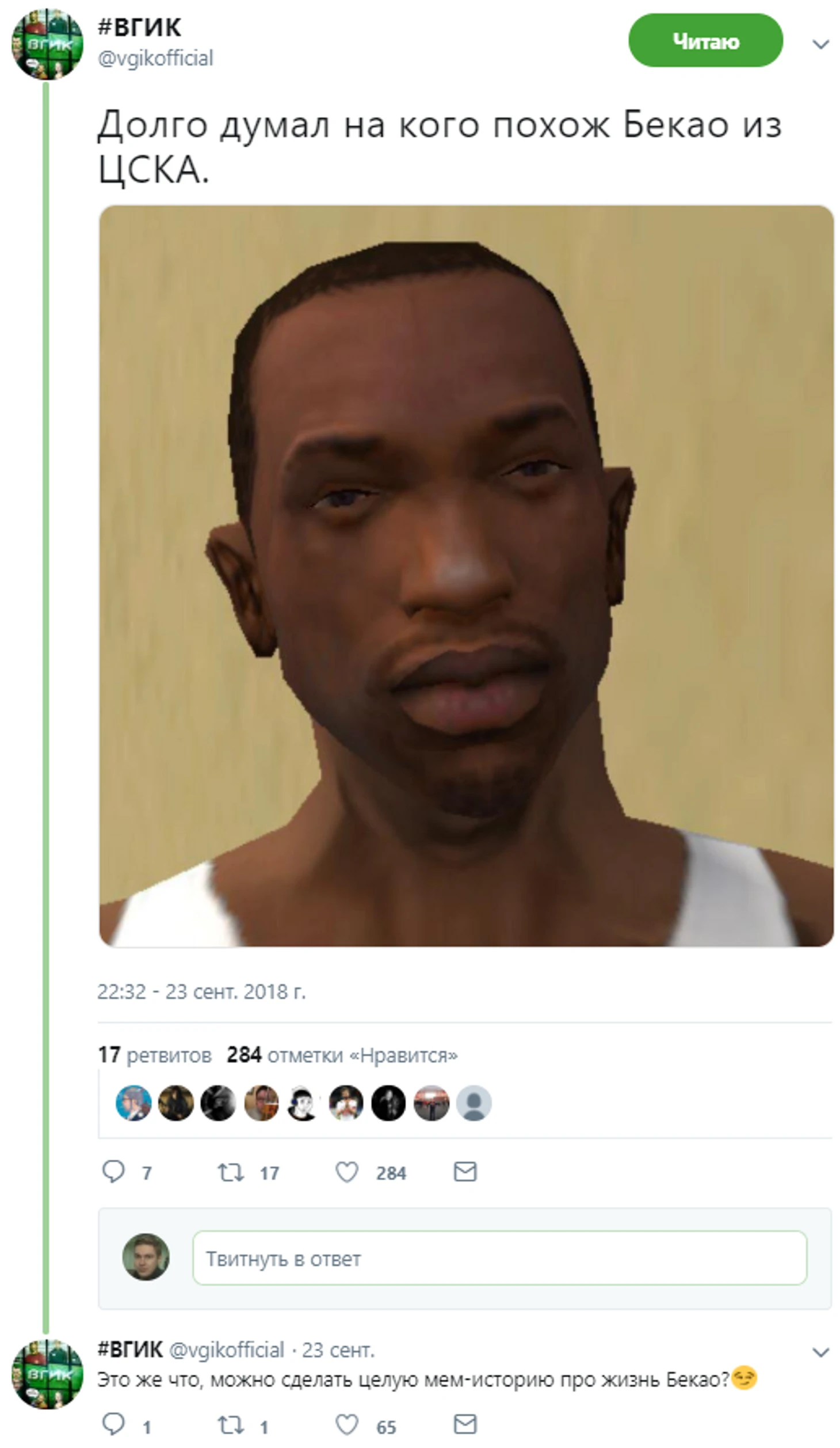 Более-менее все, кто имеет представление о российском футболе, интернете и соцсетях, знают о существовании паблика ВГИК, а, скорее всего, на него подписаны. Творцы контента в паблике любят упражняться в нахождении внешних сходств и эксплуатировании их в юмористических целях. Иногда получается не очень похоже, но смешно и вирусно, как вышло с Бекао. Не сказать, что защитник ЦСКА сильно похож на главного героя культовой игры GTA San Andreas СиДжея, но в народ идея ушла, а дальше народное творчество было не остановить. Тем более что главная игра прошлого десятилетия и её русский перевод сами подталкивают к этому.