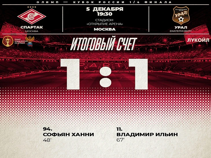 В первом четвертьфинальном матче на Кубок России «Спартак» сыграл вничью – 1:1 с «Уралом».