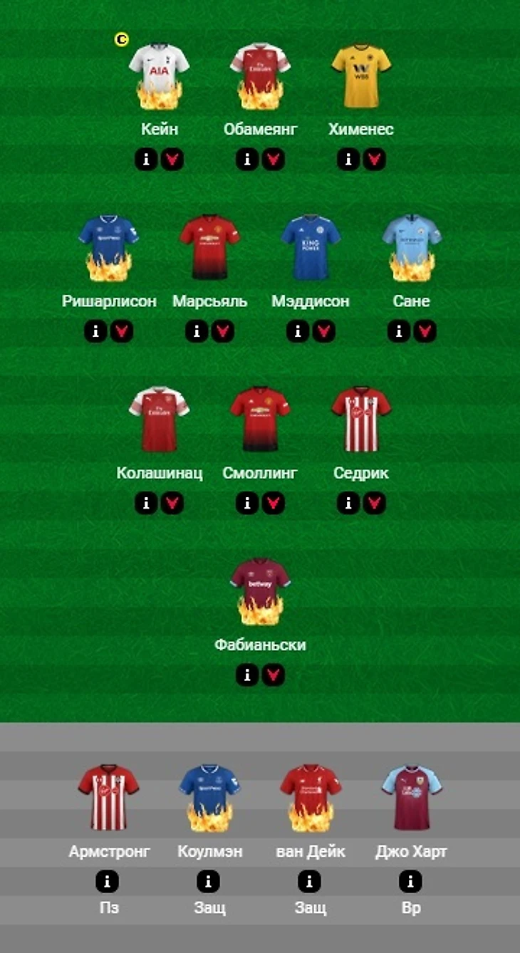 *Капитан. Основной выбор у большинства пролегает между Обамеянгом и Кейном на этот тур, из этой парочки я бы выбрал Харри, ввиду его успехов в очных поединках с Лестером. Из футболистов в огне выделяются представители Сити: Стерлинг и Сане, но здесь можно как и срубить куш, так и получить гроши. Из игроков в форме, несложные соперники у Фелипе Андерсона и Марсьяля, рисковать стоит с ними. Немного неожиданно можно закэпить Азара, если Челси забивает горожанам, что происходит только в половине последних матчей, то не без участия бельгийца.