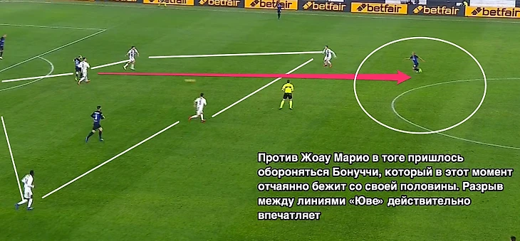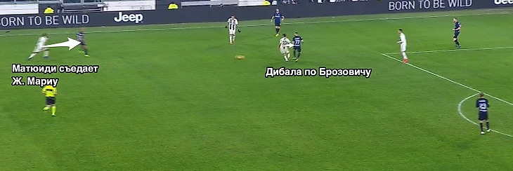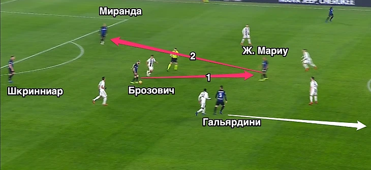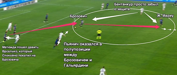 При определенной расхлябанности полузащитников «Юве», комбинация «отдай на Брозовича а он найдет Жоау Мариу» стала действительно грозным оружием «Интера». Пьянич и Бентанкур в первом тайме показали действительно не лучший пример того, как нужно страховать опорную зону, а португальскому полузащитнику «Интера» действительно понравилось бегать в этот коридор.
