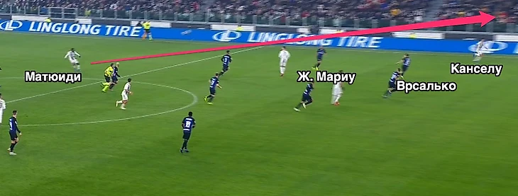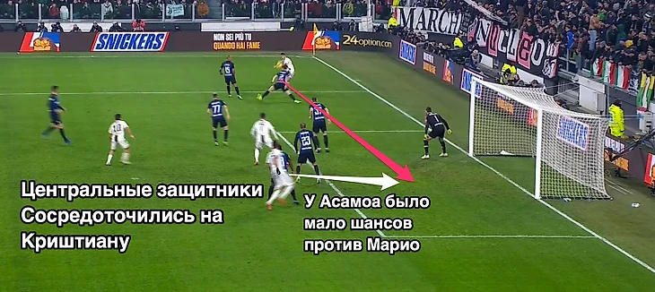 Кстати, Жоау Мариу таки добежал до Канселу, но не сильно активно пытался помочь Врсалько. В момент навеса он вроде сделал движение от мяча. Тяжело что-то сказать и Асамоа, который вроде как крайний защитник и не может всегда на равных бороться на втором этаже с элитными игроками второго этажа. В этом еще одна прелесть «Юве»: у Аллегри в распоряжении выходят два игрока, которые номинально могут сыграть как флангового нападающего, так и центрального. Пока Макс может себе такое позволить, у всех соперников будут проблемы при обороне против навесов.