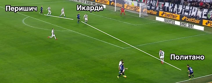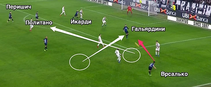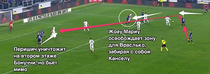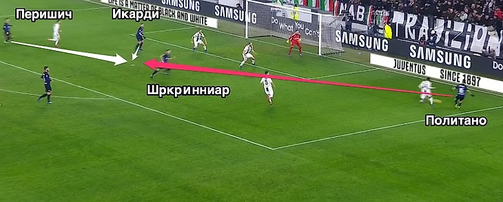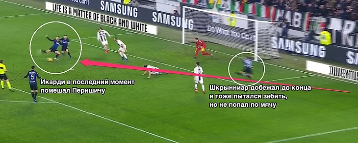 Вот, кстати, классный пример того, как идеи Спаллетти работают, но Перишичу немного не хватило точности. Но такого было слишко мало, защита «Юве» слишком сильная…