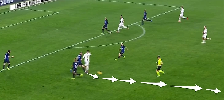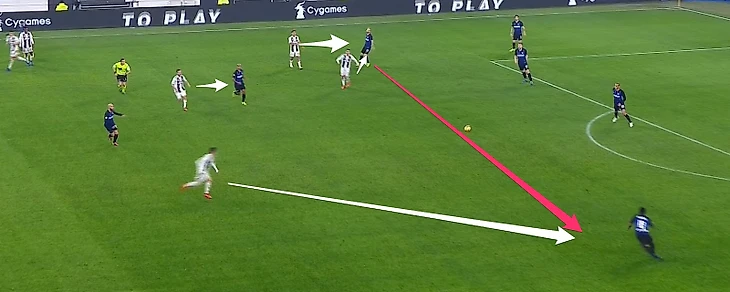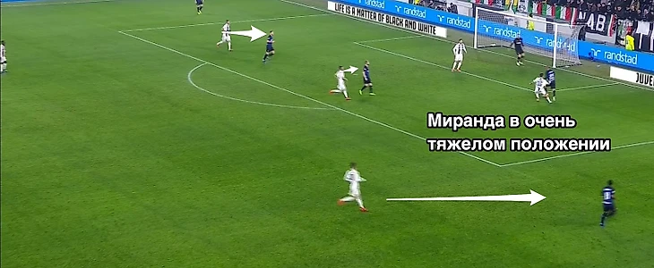 После матча обоснованно звучало мнение, что «Интер» играл на все 100%, но «Ювентус» мог прибавить еще. Мне показалось, что именно это «еще» во втором тайме сыграло свою важную роль. Помните за что я долго хвалил «Интер»? За топовую игру при розыгрыше мяча под прессингом. Приблизительно после 50-й минуты хозяева начали все туже закручивать гайки и перестали казаться беспомощными во время прессинга. Все это было умножено на накопившуюся усталость в ногах футболистов Спаллетти. По ходу второго тайма мы все чаще видели эпизоды вроде этого, где игрокам разыгрывающей группы не оставалось никаких вариантов продвижения