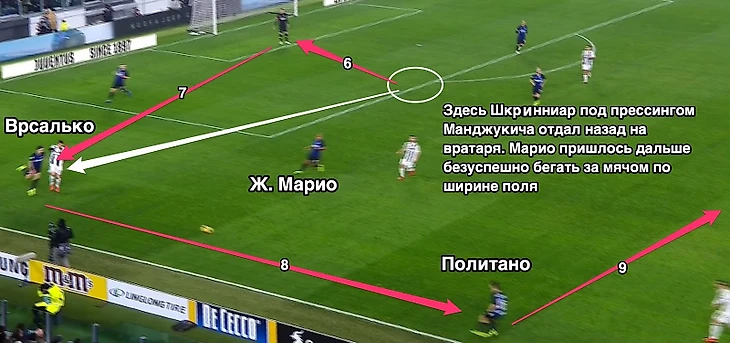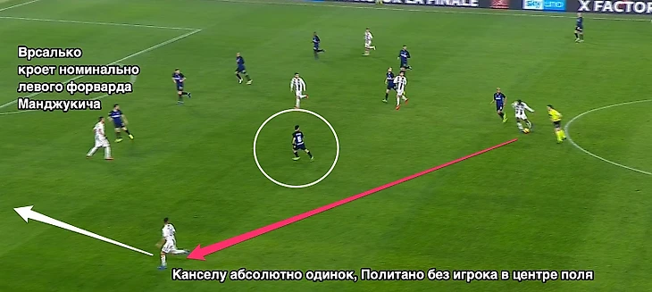 Понятное дело, что это мелочь, которая редко дает о себе знать в большинстве матчей с соперниками более низкого уровня, но с самой непобедимой командой чемпионата Италии каждая мелочь делает результат. Когда у тебя на фланге один защитник против двух-трех бегущих соперников экстра класса – жди, что это в один момент может выстрелить. И это выстрелило: Канселу не спеша принял мяч, поднял голову, и аккуратно положил мяч на Манджукича. Вопрос: не мог ли Врсалько по-агрессивнее встретить оппонента.