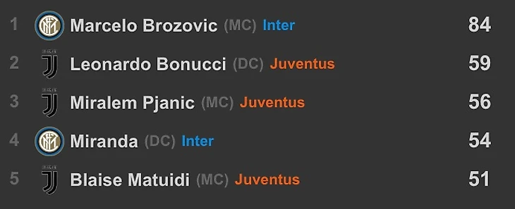 Марцело продолжает держать поднятую планку и оставаться лидером Серии А по среднему количеству передач за матч (82.3, у второго Пьянича 71.8). Чтобы понять насколько высок его вклад в комбинационную игру команды, нужно посмотреть на его статистику в сравнении с другими игроками в этом матче.