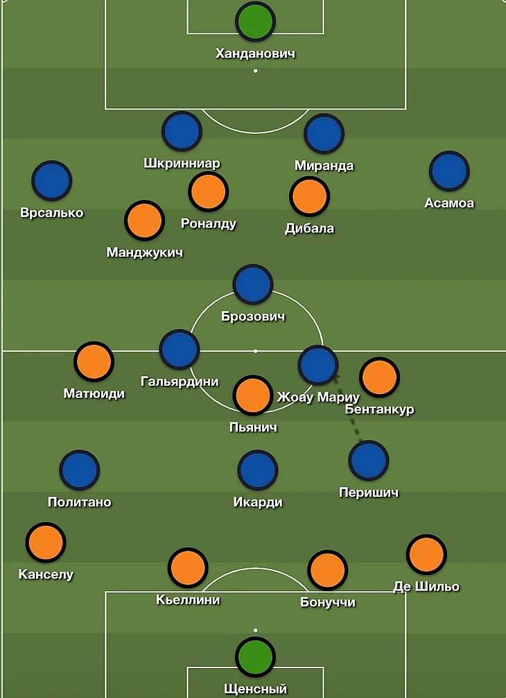 Подопечные Спаллетти имели действительно много шансов наказать хозяев за определенную расслабленность в первом тайме, но они не очень изобретательно пытались реализовывать провалы «Ювентуса». Слишком уж явно гости пытались все свести к фланговым атакам. В позиционных атаках все сводилось к тому, чтобы раскатать большинство на фланге (в основном на правом, где отлично сыгрались Политано и Врсалько) и подать в штрафную в поисках Перишича/Икарди.