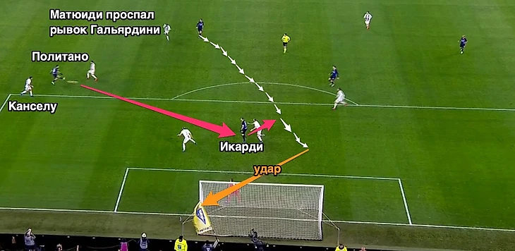 И снова цепочка идеальных действий футболистов «Интера»: идеальный отбор, идеальный рывок, идеальный пас на ход Политано, который идеально обыграл Матюиди и идеально прострелил на Перишича… К сожалению Мауро Икарди не разобрался в ситуации и поздно понял, что передача шла не ему.