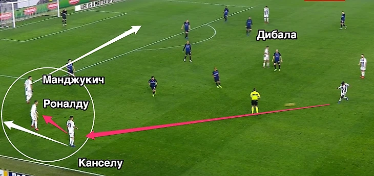 Если вы хотите понять как выглядит перегруз фланга в футболе, то этот кадр вам точно поможет. Канселу, Манджукич и Роналду пришли на 10 квадратных метров чтобы немного испортить жизнь Врсалько и Политано. Через пару секунд Канселу забегает по флангу за спину Роналду чтобы навесить на Манджукича, который уже в штрафной площади.