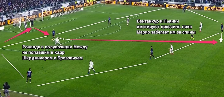 Трио Манджукич-Роналду-Дибала – это точно не лучшая компания для активного прессинга на чужой половине, особенно когда они играют не на полных оборотах. «Ювентус» испытал достаточно серьезные проблемы, сделав ставку на удушение «Интера» силами этих форвардов разного уровня звездности. Даже не считая элитной игры Брозовича, у Спаллетти набор игроков для выхода со своей половины более, чем солидный.