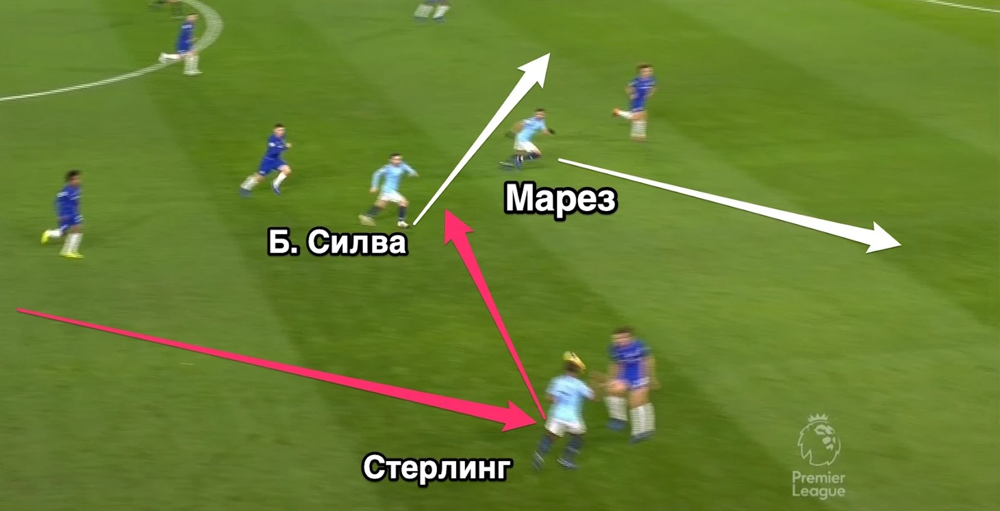 Стерлинг и Марез оставили в дурках Алонсо и Виллиана, но возле Рюдигера нет вообще никого, кроме вбегающего в компании Аспиликуэты Давида Сильвы. Мяч в итоге был переведен на противоположный фланг на Сане.