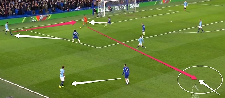 В этом эпизоде один пас Эдерсона отрезает четырех прессингующих игроков  (3 нападающих + Ковачич), а Канте и Жоржиньо оказываются в полупозициях и уже никак не помогают команде. Мяч оказывается у Д. Сильвы, у которого на выбор было сразу два фланга на разрыв (Аспиликуэта справа полностью изолировался от прессинга).