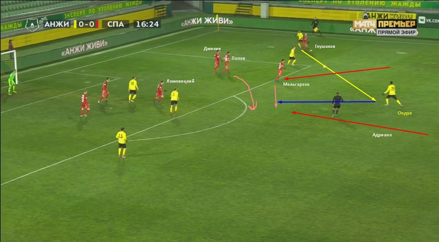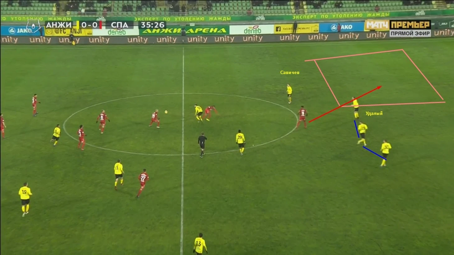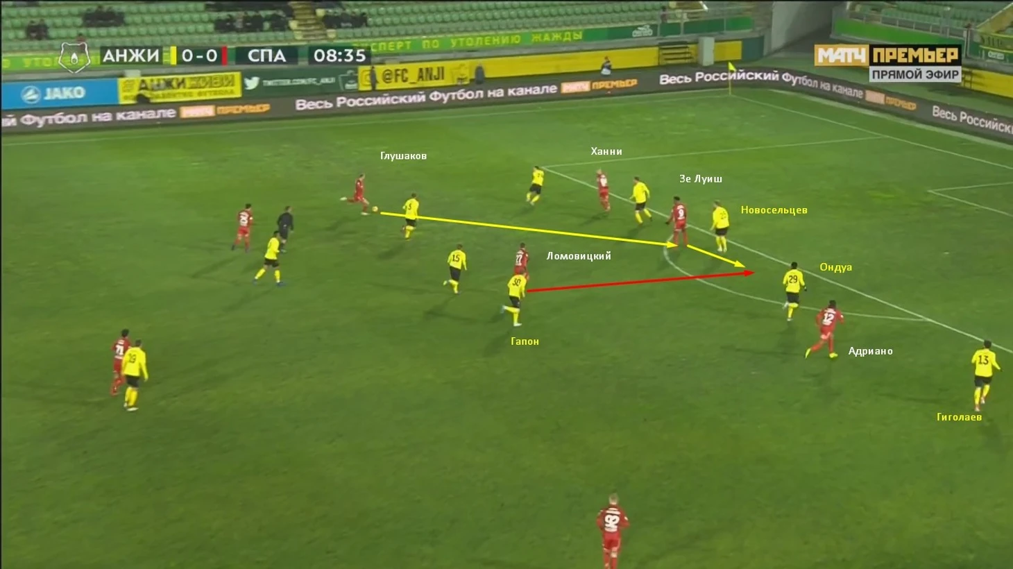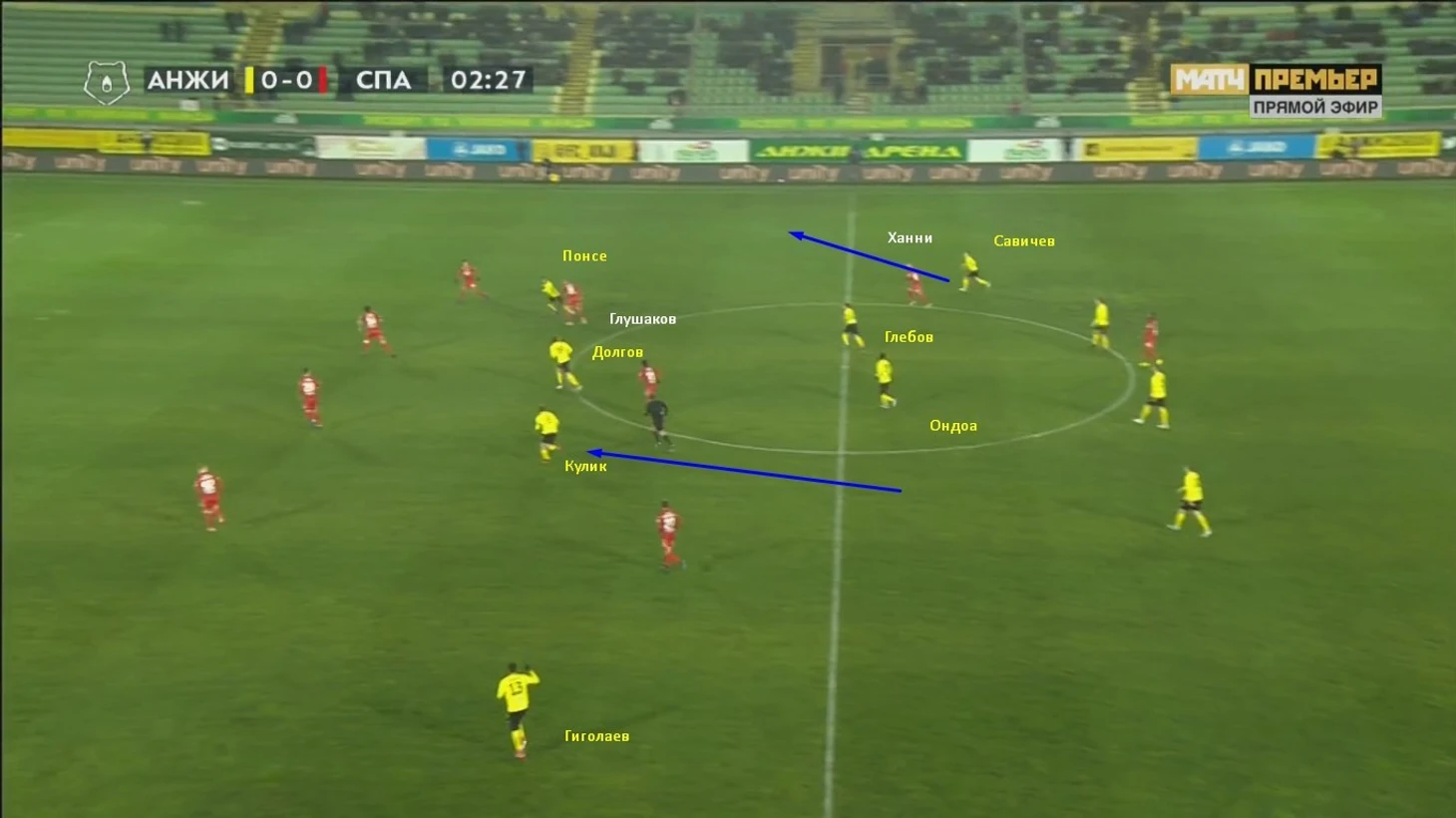 Высокие позиции фулбеков (Савичев и Гиголаев) "Анжи" могли сыграть с ними злую шутку уже в дебюте встречи. Вот тут подбор мяча выигрывает Глушаков. У "Анжи" из зоны полузащиты в атаку побежал Кулик (делал это весь матч+поднимался для прессинга к нападающим), а справа оголил зону Савичев. В итоге Глушаков даёт пас на Ханни: