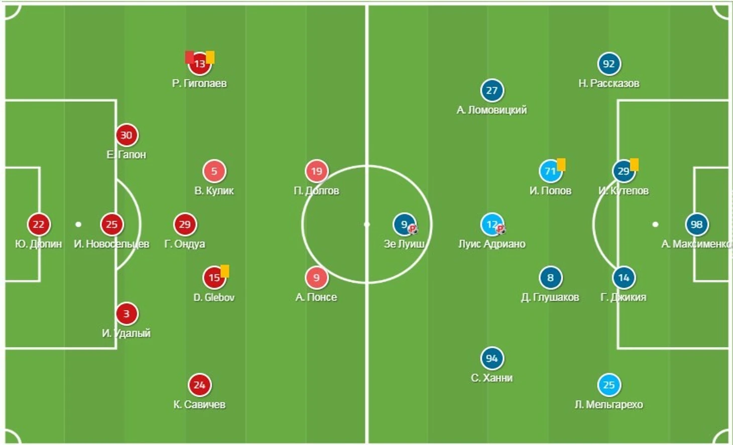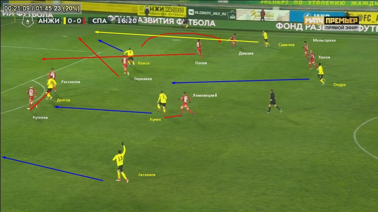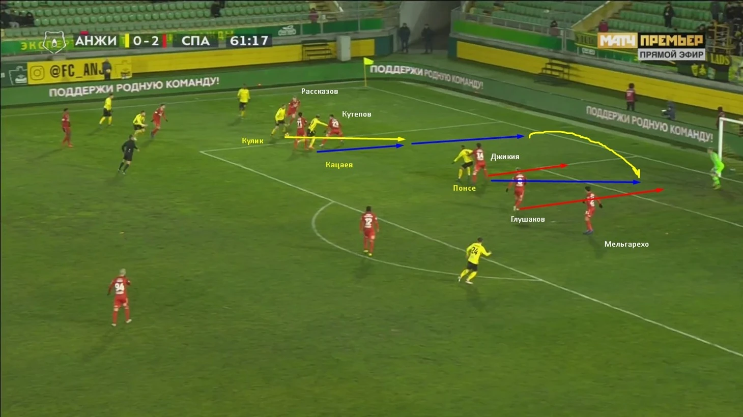 Впрочем, чуть раньше у них сработал контрпрессинг после штрафного и подбора Рассказова. Всё это привело к удару Понсе из убойнейшей позиции. Кулик делает передачу между Рассказовым и Кутеповым на Кацаева, тот идёт к лицевой и даёт на Понсе, которого никто не держит, так как Джикия побежал прерывать передачу, а Глушаков проиграл позицию: