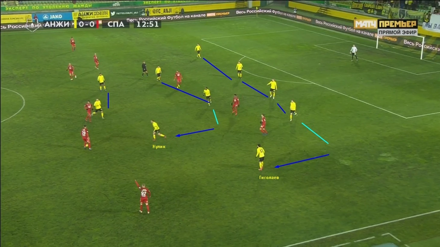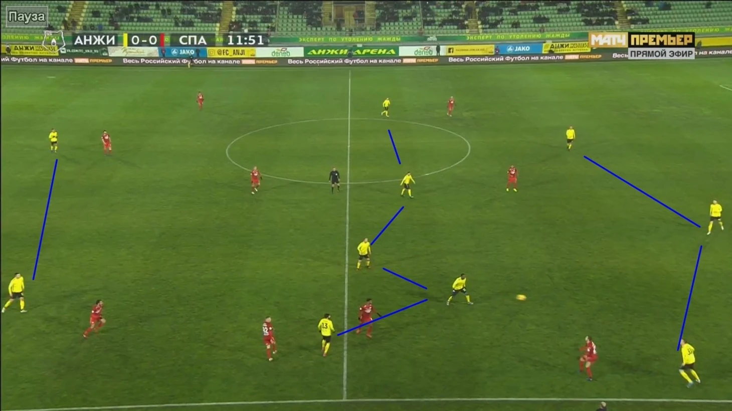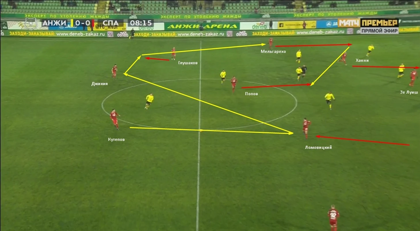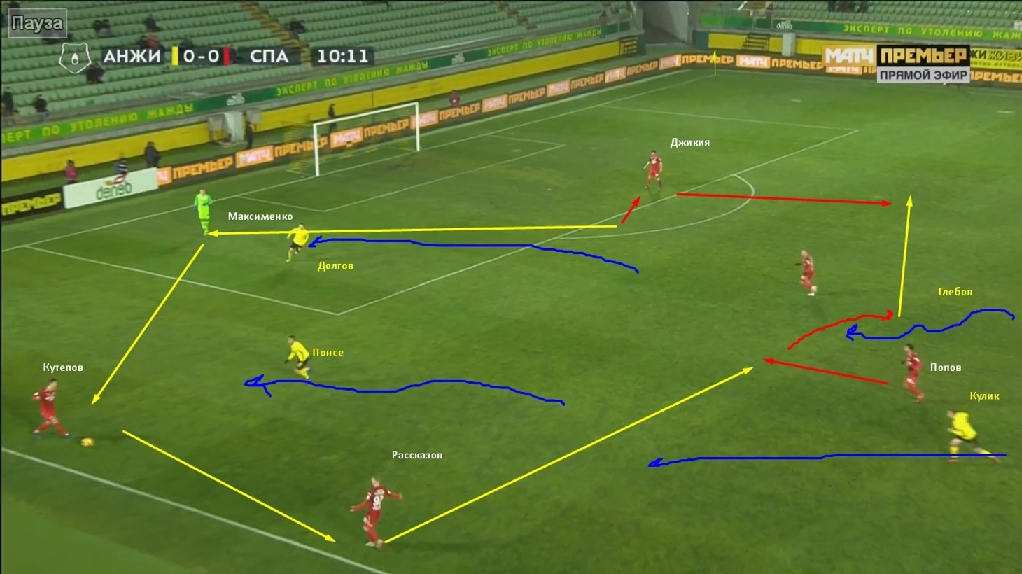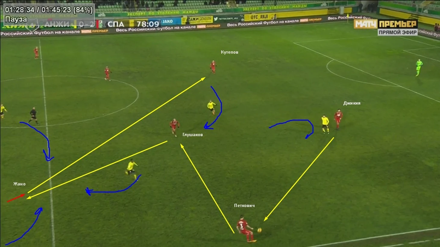 Что до командного прессинга "Спартака", то он включался в двух случаях. Первый - при пасе "Анжи" на вратаря. Второй - если красно-белые теряли мяч в позиционной атаке на трети соперника. Но как уже отмечал в предыдущих разборах - о какой-либо наигранной системности можно говорить после перерыва. Такие вещи отрабатывать и потом регулярно и правильно претворять в жизнь при 2х играх в неделю проблематично.
