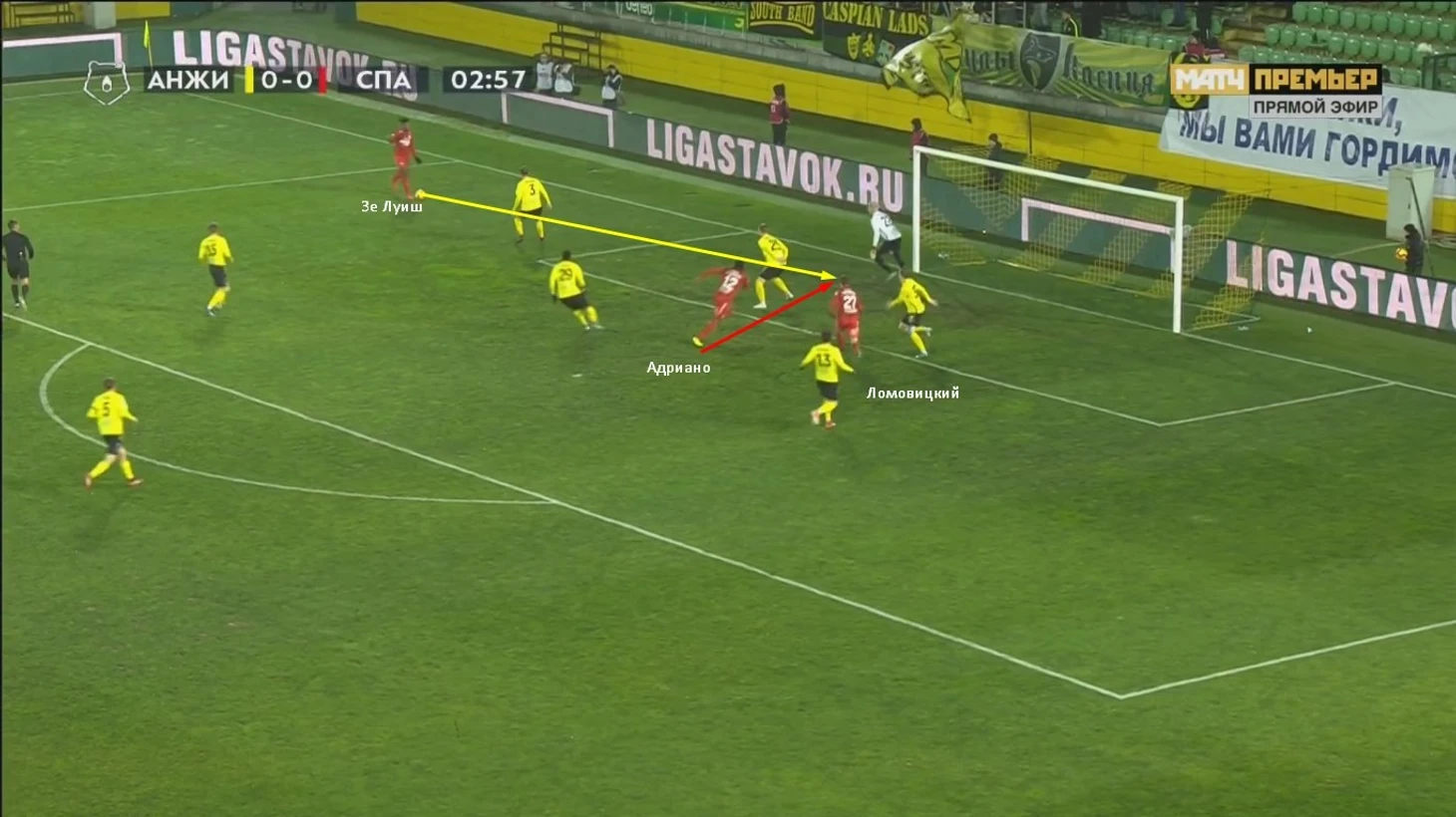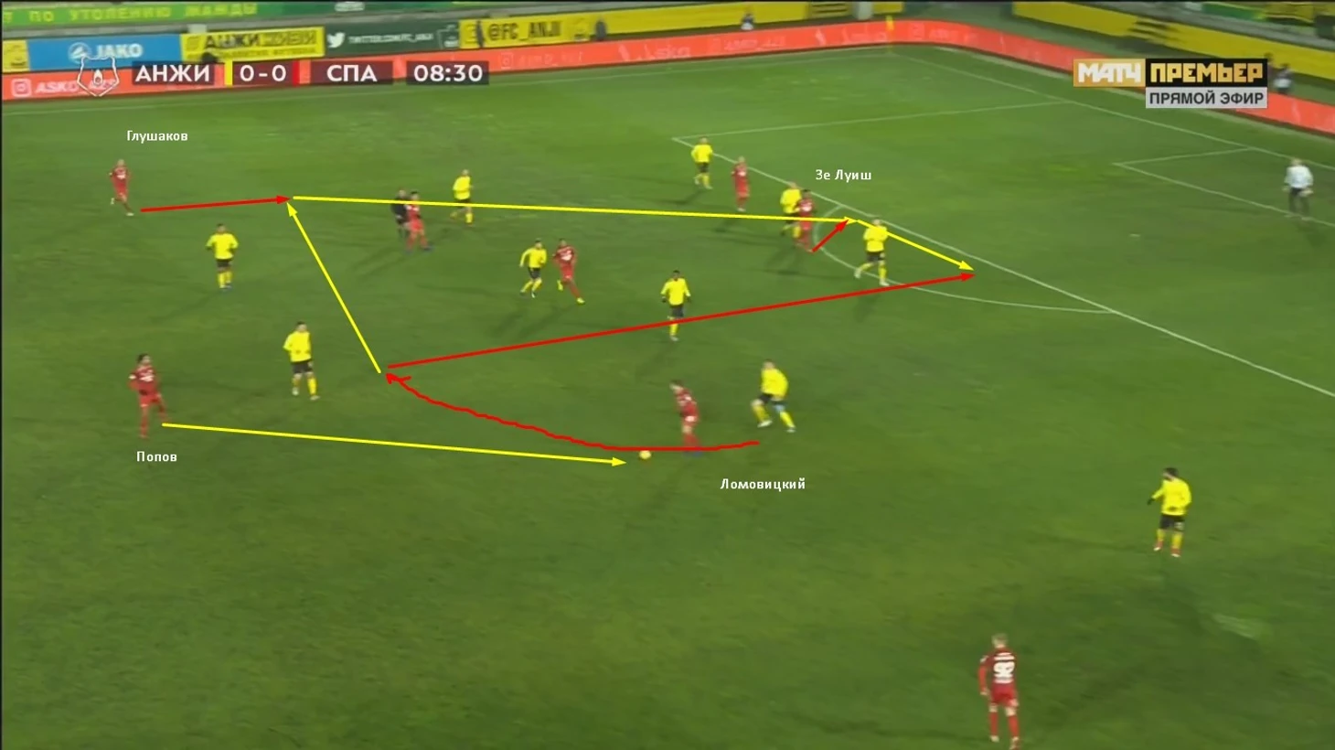 Попов получает мяч и пасует на Ломовицкого, тот смещается в центр, даёт поперёк на Глушакова и сразу же Александр делает рывок к штрафной. Глушаков выполняет разрезающую передачу на Зе Луиша, который пяточкой под удар Ломовицкому: