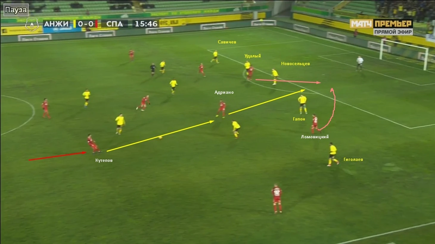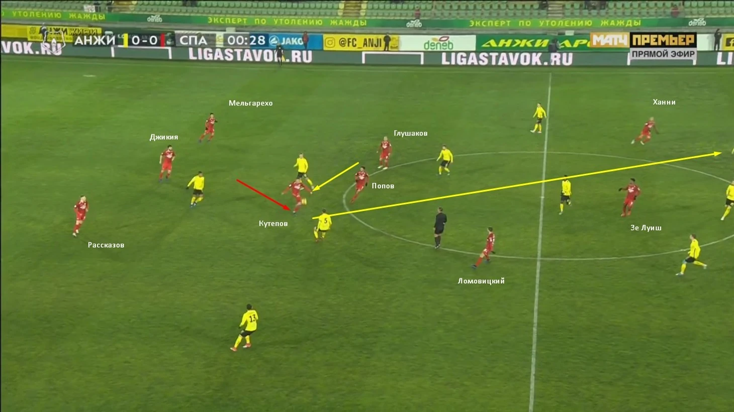Вот тут на первой минуте, после длинного ввода мяча от вратаря "Анжи" подбор выигрывает Глушаков и скидывает мяч на Кутепова. Так как махачкалинцы поднимались высоко при начале атак - позади крайних защитников оставалось много свободного пространства. Кутепов это видит и делает передачу на Ханни: