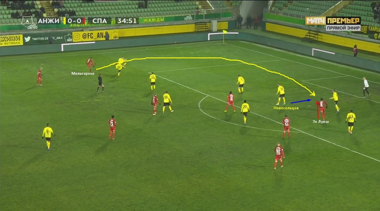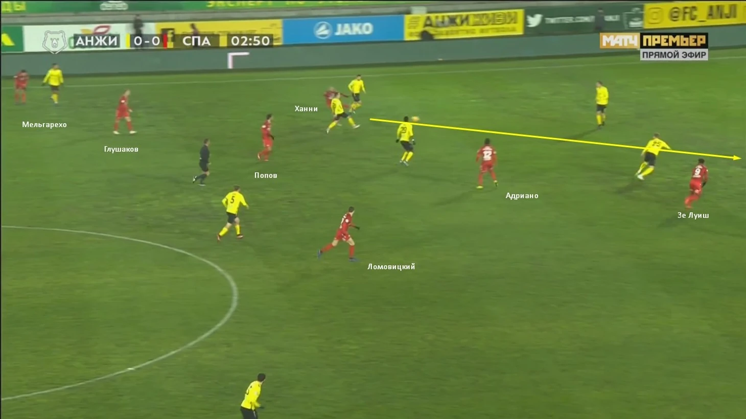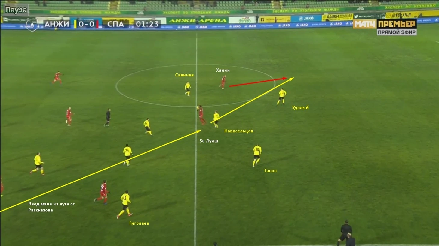 Ещё один эпизод со свободной зоной за Савичевым. Ханни перехватывает мяч после ввода от вратаря махачкалинцев и отдаёт на Зе Луиша: