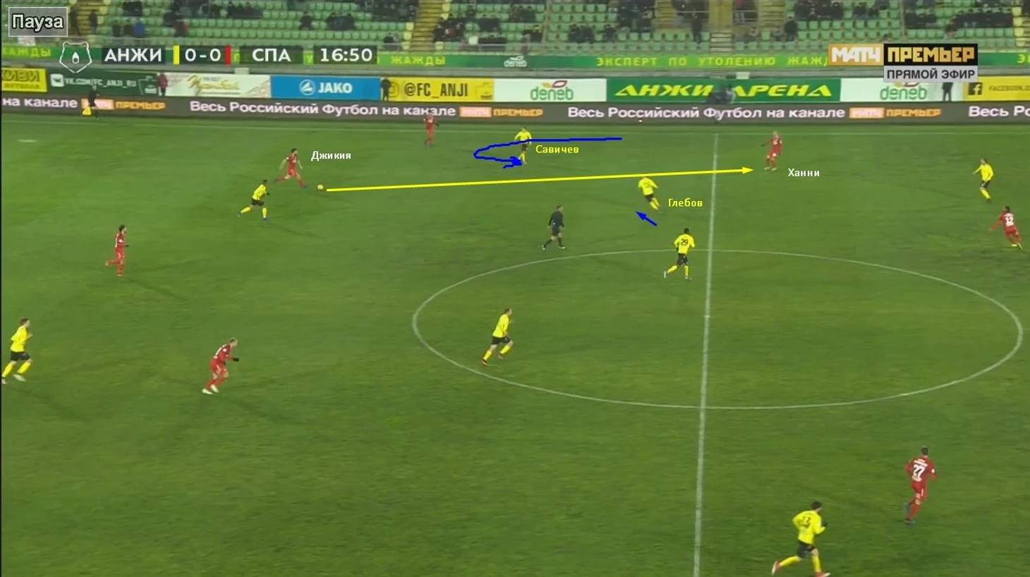 Такая же история после ввода "Спартаком" аута. "Анжи" стянул большие силы к флангу, а Савичев высоко - в итоге Ханни вновь мог принимать мяч на свободном пространстве: